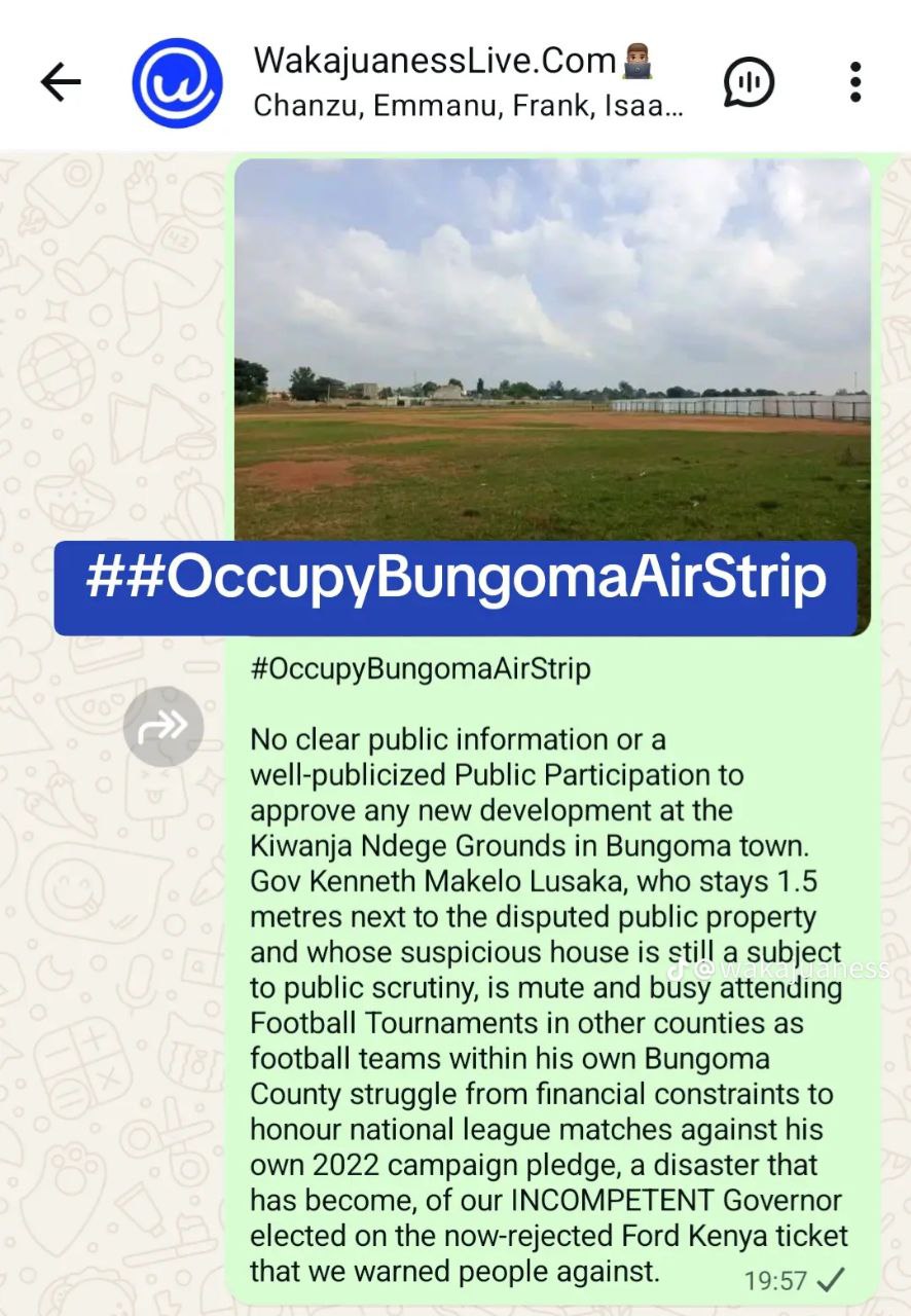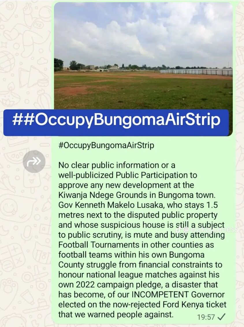 A section of Bungoma residents are set mount a protest on Tuesday 30th Dec 2025 against the government’s move to start construction on the Kiwanja – Ndege piece of land against Court orders and without proper public participation.